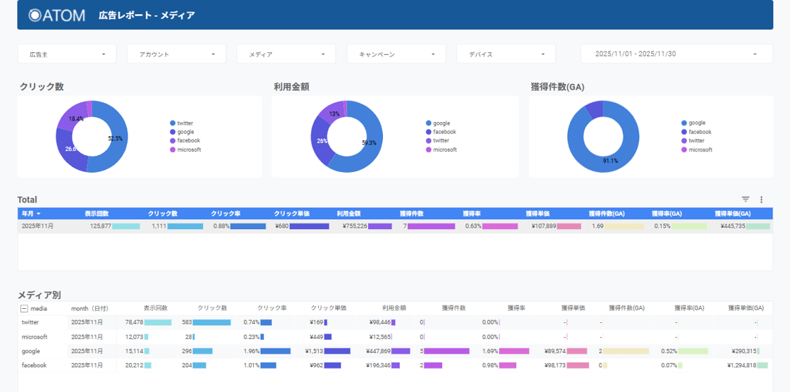 キャンペーン単位で計測した「キーイベント」の件数を各媒体の配信実績と統合してレポーティングすることができます。