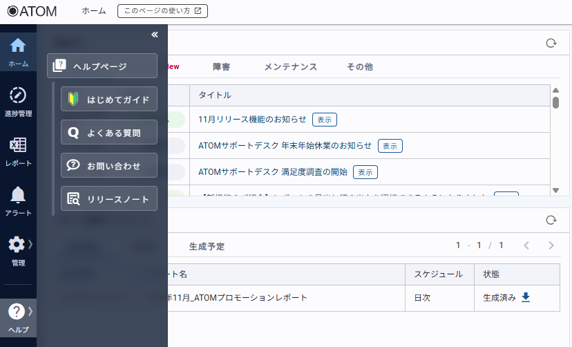 ATOM画面内のサイドバー「ヘルプ」からヘルプページ内の各コンテンツにアクセスしやすくなりました🎉